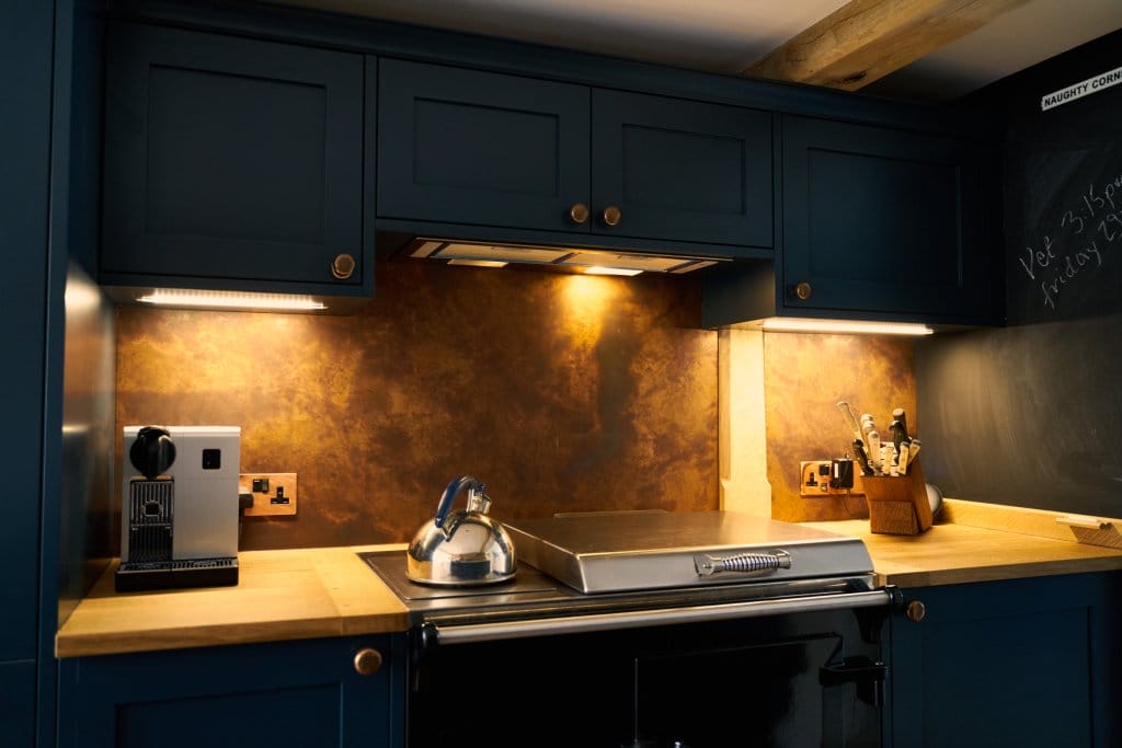 As one of the key features of your kitchen, your splashbacks make an ideal place to introduce a bold statement material. In the interior below, a tarnished copper splashback glows magnificently in the warm lighting, creating a stunning focal point to the room. A sleek metallic mirrored surface or lavish veined marble also make beautiful choices.