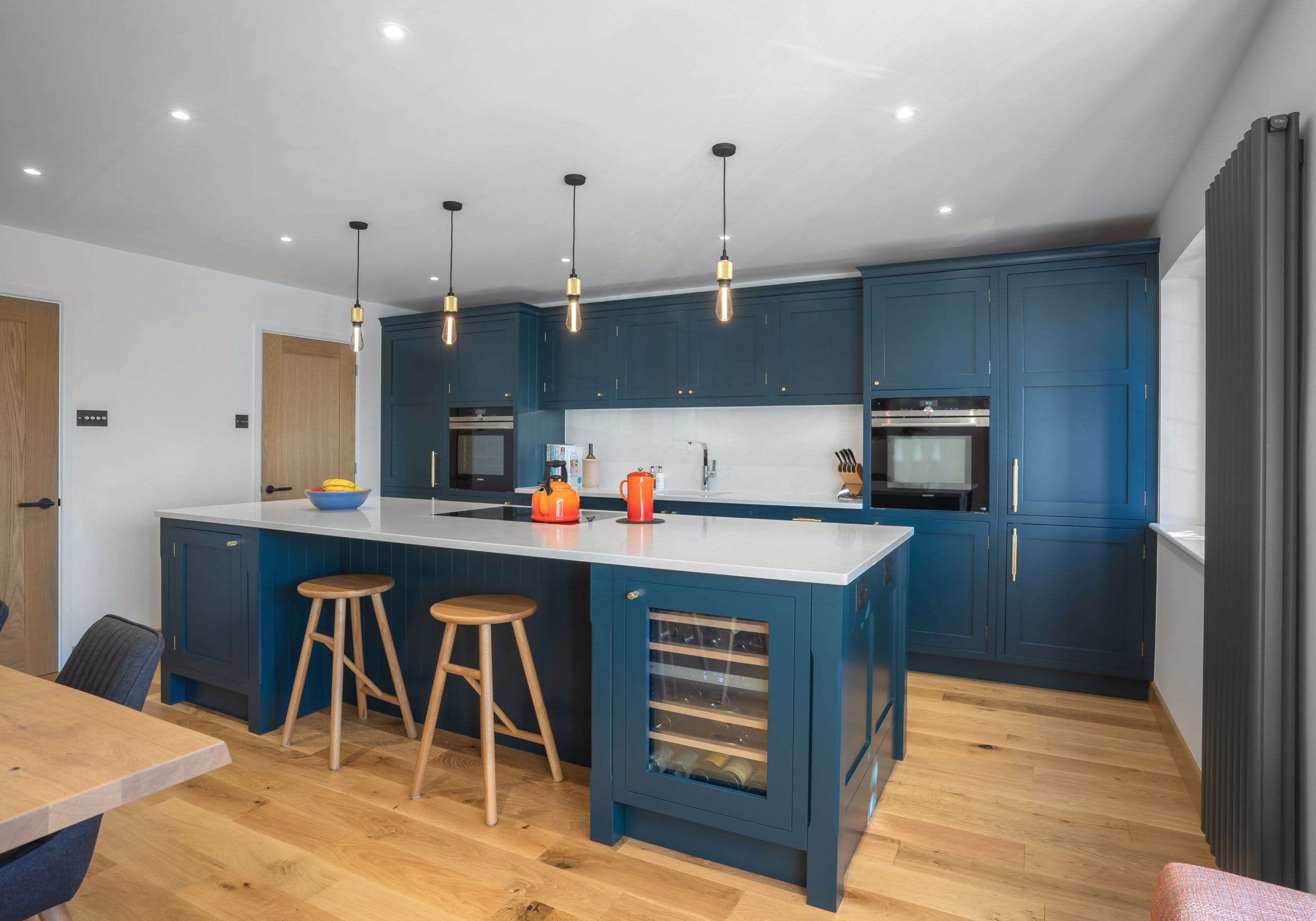For a timeless kitchen colour scheme, look no further than opting for an elegant grey. This colour flatters any space and works fantastically in both modern and traditional kitchens. Grey endures in popularity with our clients for good reason; its simplicity and grace exude style and taste. This tone complements a variety of accent colours. We included these stylish orange barstools in the below project to add a contrasting feature which gives a modern and vibrant edge to a simple design.