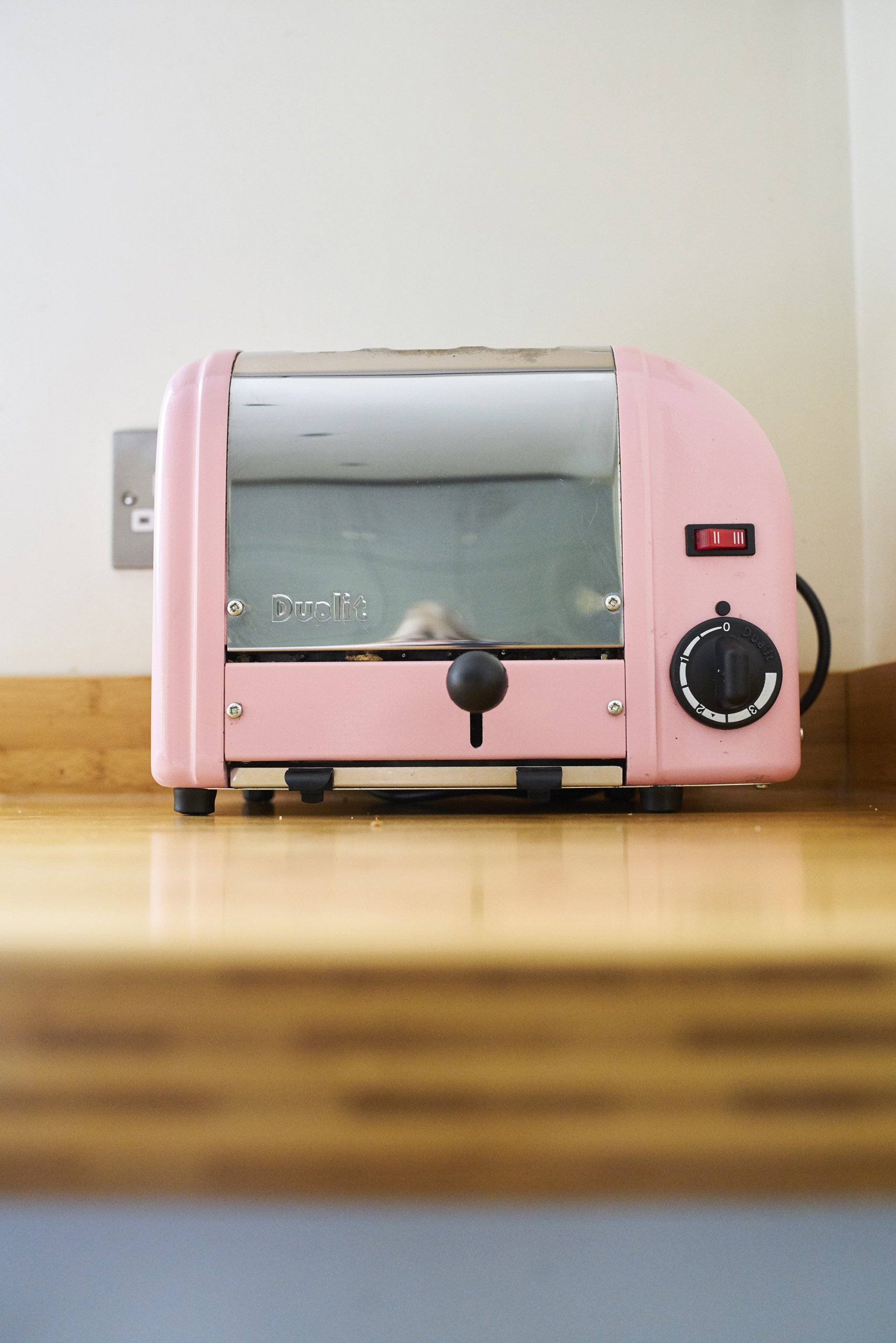 Charlotte loves to cook, so the centrepiece of this kitchen is the blue Falcon double-oven range with practical narrow storage units either side for chopping boards and spices, plus encaustic tiles flanking the brushed aluminium splashback. Both the island and wide bank of units on the back-wall house extra-deep drawers for pots, pans and dishes, again making this kitchen ultra-user-friendly for a keen cook. The kitchen larder, integrated Bosch fridge-freezer and hidden microwave are all discretely built into the scheme so the effect is of a painted shaker kitchen that feels well-furnished; the antithesis of its high-tech contemporary counterparts. The Scandinavian sourced, glass pendant lights sit comfortably alongside the other bolder details such as the retro pink toaster and baby blue weighing scales which add pops of colour.