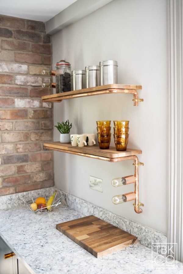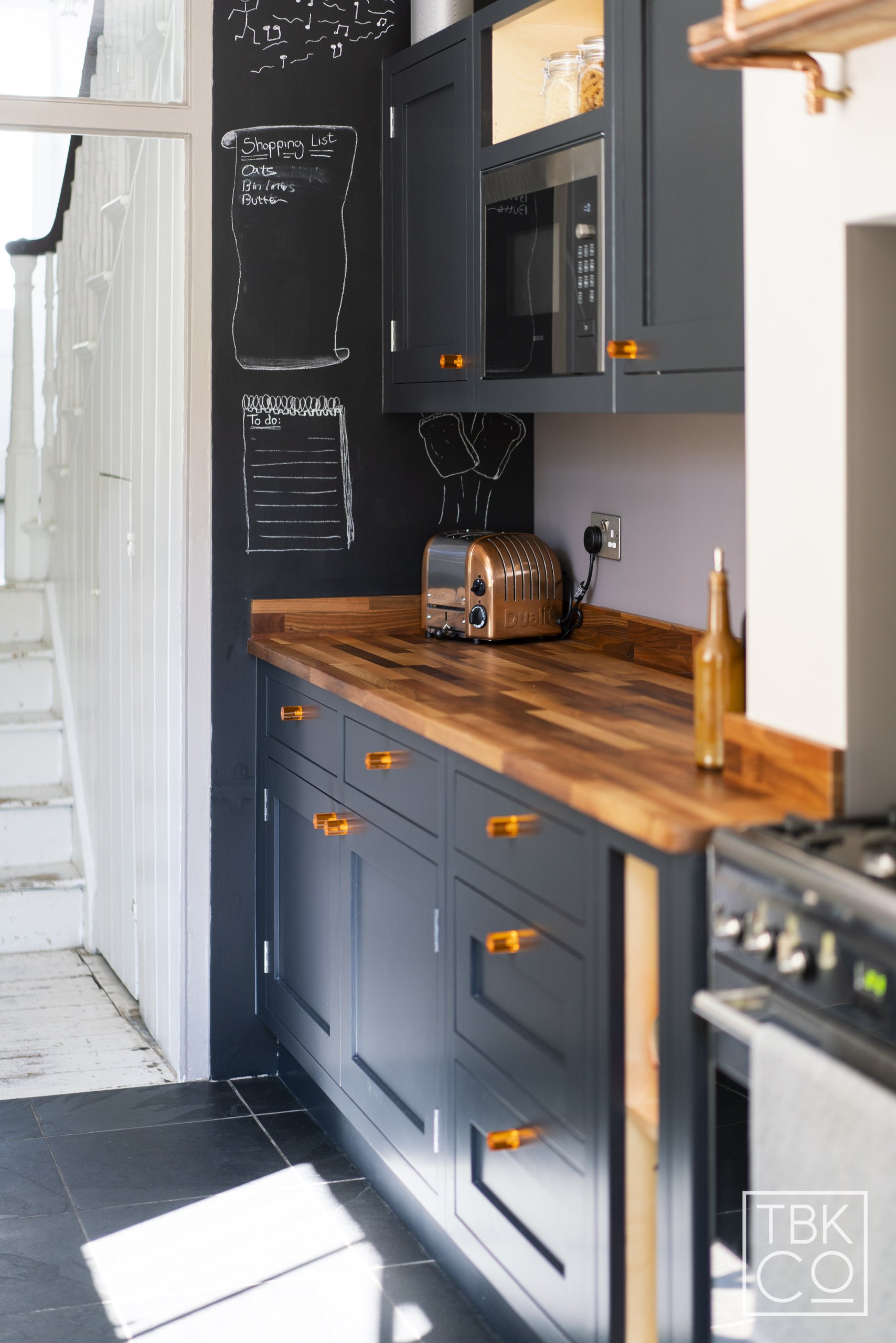 We focused on creating a space that felt like custom furniture rather than a typical fitted kitchen. The off-black Shaker cabinets bring a sophisticated touch without overwhelming the room. To keep things airy, we used a mix of closed and open cabinetry, exposing warm birch ply interiors in some of the open units to add character. Copper tones and a white feature wall balance the dark cabinetry, while natural light keeps the space feeling bright and inviting. Wanting to make their kitchen truly unique, there is the addition of custom copper pipe lighting and shelving made in collaboration with a local craftsman, adding an industrial flair. The range cooker and fridge/freezer are featured elements, seamlessly integrated into the design with open shelving and a concealed extractor. With walnut and quartz countertops, brick tiles for a textured wall, and a playful blackboard wall for everyday notes, we layered rich textures and thoughtful details throughout.
